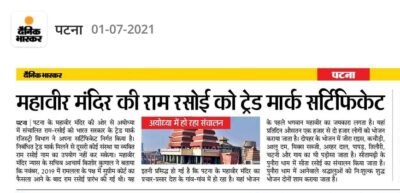 महावीर मन्दिर की राम-रसोई को मिला ट्रेड मार्क सर्टिफिकेट