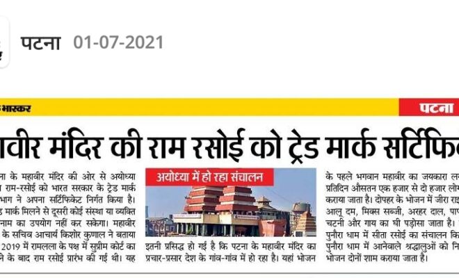 महावीर मन्दिर की राम-रसोई को मिला ट्रेड मार्क सर्टिफिकेट
